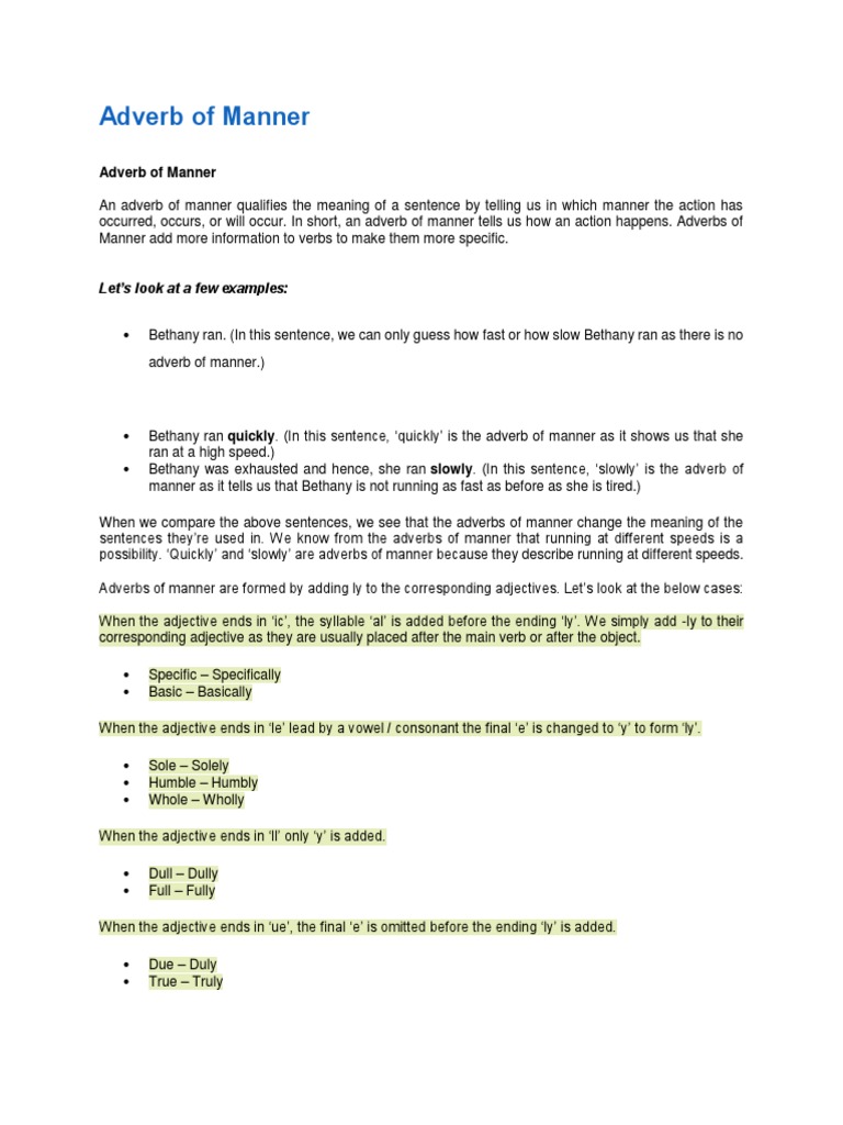 They typically come at the end of the sentence. Adverbs of manner tell us how something happens. Warmly, coldly, badly, quickly, slowly, bravely. They have their own rules. Angrily, happily, easily, sadly, rudely, loudly, fluently, greedily, etc adverbs of place: